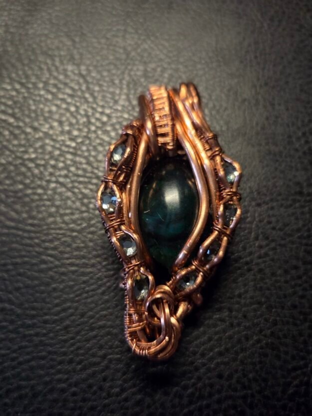 Dark Green Petri Stone and Gray Crystal Pendant In Raw Copper 2 1/2 in (L) X 1 1/4 in (W)