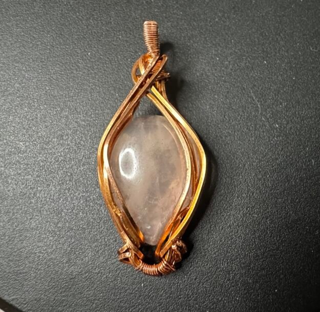 This Pendant is aprox. 2.5 in (L) X 2.0 in (W) featuring a Rose Quartz stone and is wrapped in Raw Copper Wire